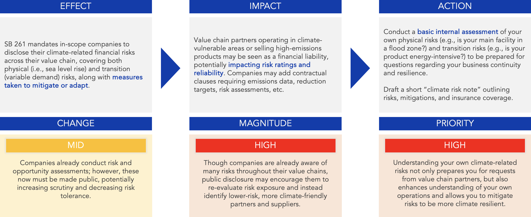 California’s climate disclosure laws will only directly apply to a few thousand companies doing business in the state; a small fraction of the several millions of businesses operating across the U.S. Even so, the laws are likely to have an extended reach outside of both geographical boundaries and immediate scope, and may create cascading demands for climate-related data flowing towards small- and mid-market businesses nationwide.